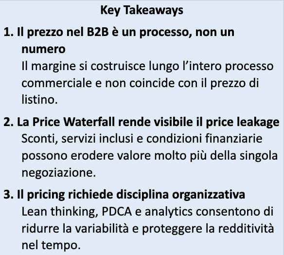 Attraverso il modello della Price Waterfall, applicato con disciplina Lean e supportato da strumenti analitici evoluti, il pricing può trasformarsi da variabile reattiva a processo strutturato e misurabile diventando una leva strategica di creazione di valore.