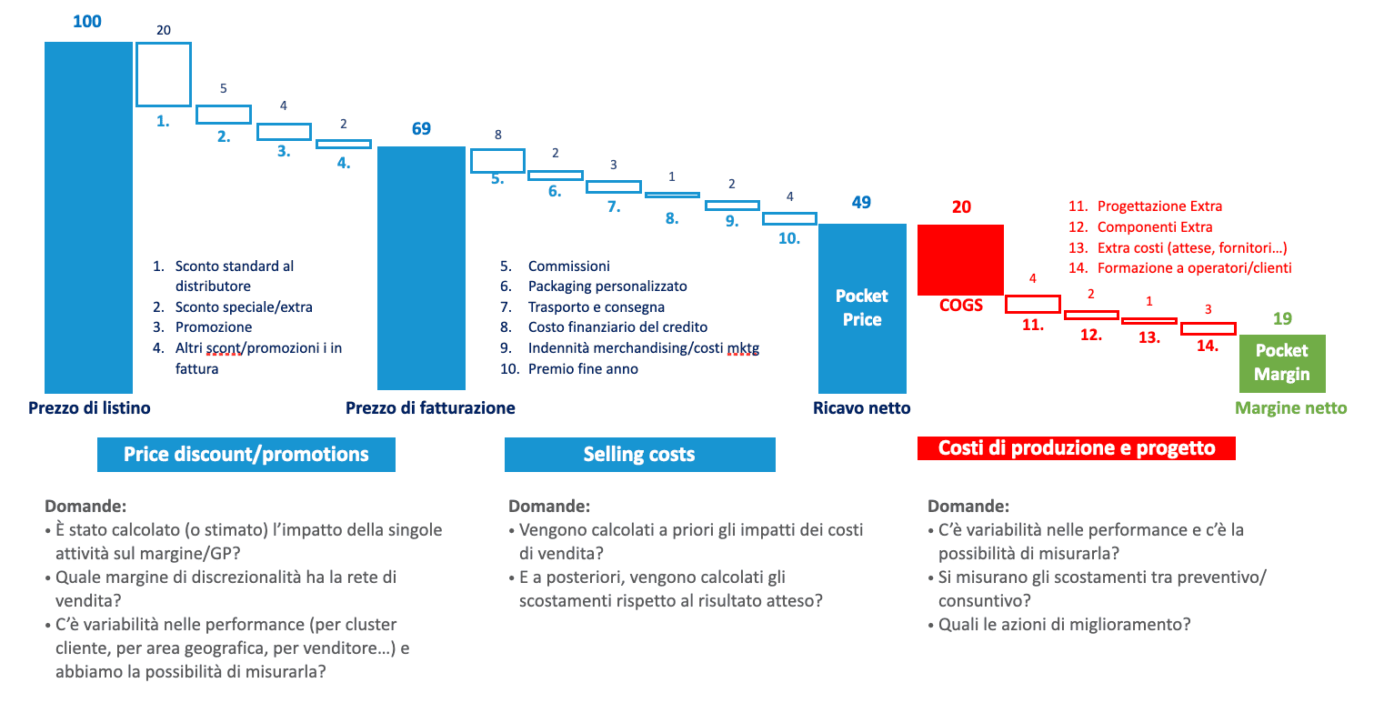 La Price Waterfall (cascata del prezzo) consente di visualizzare l’erosione progressiva del valore dal listino al margine reale. (Figura 1: Price Waterfall – il modello di riferimento)