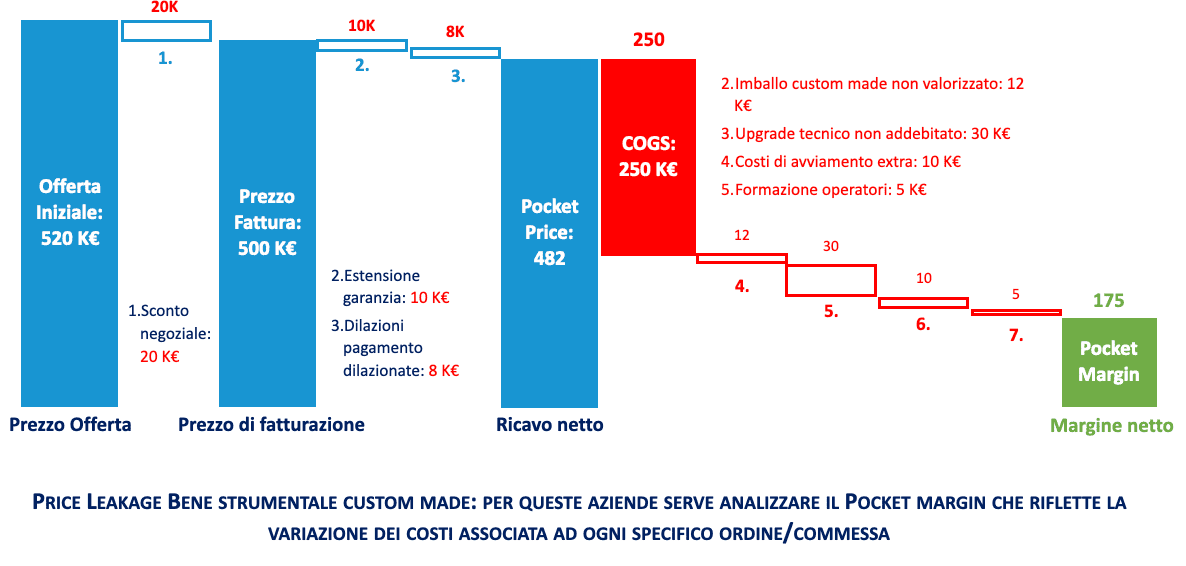 Nel caso di macchinari o impianti personalizzati, la dinamica è ancora più complessa. Per le aziende che vendono prodotti o servizi altamente customizzati, il pocket price da solo non cattura le differenze nei costi necessari per servire clienti specifici.  Per queste aziende serve analizzare il Pocket Margin che riflette la variazione dei costi associata ad ogni specifico ordine/commessa.